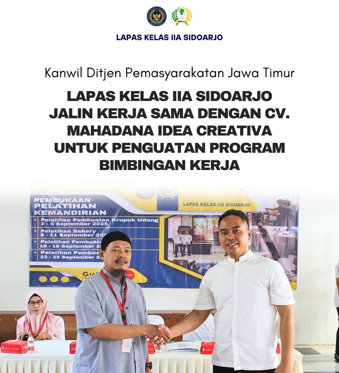 MoU ditandatangani langsung oleh Kepala Lapas Kelas IIA Sidoarjo, Disri Wulan Agus Tomo, bersama Direktur CV. Mahadana Idea Creativa, Teguh Adi Prabowo. Kerja sama ini merupakan langkah strategis dalam memperkuat program Bimbingan Kerja (Bimker) di lingkungan Lapas Sidoarjo.