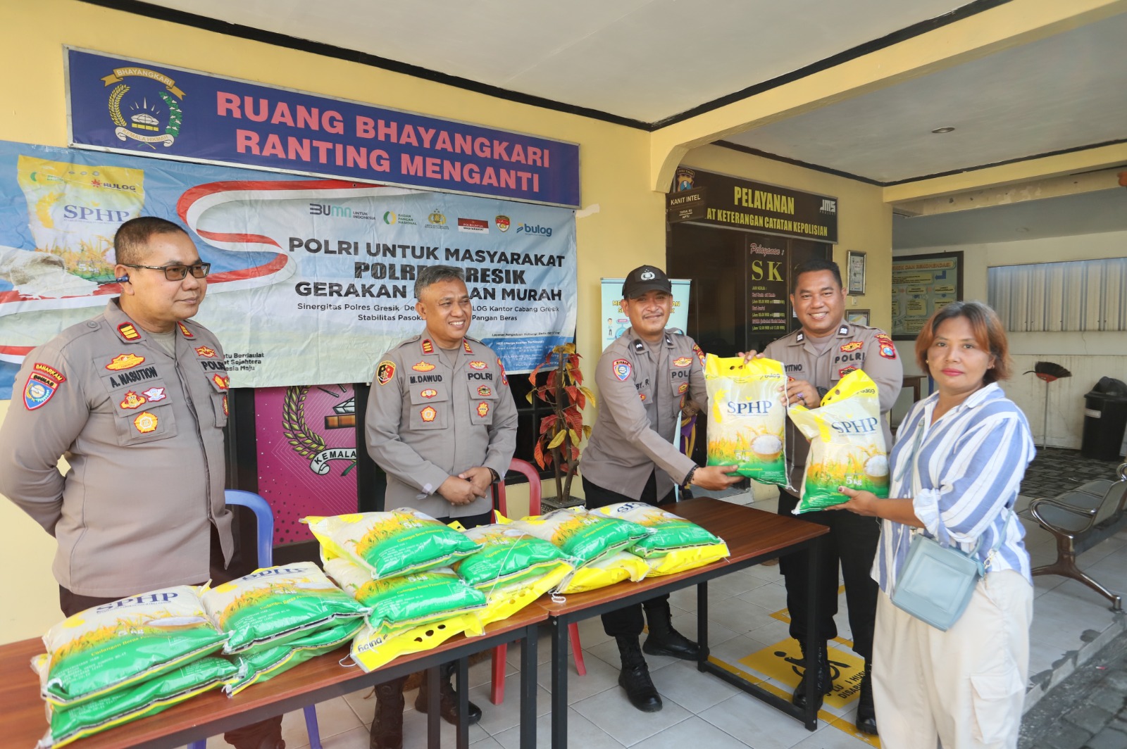 Penyaluran beras SPHP (Stabilisasi Pasokan dan Harga Pangan) berlangsung di depan Mapolsek Menganti, Kecamatan Menganti, Kabupaten Gresik, dan disambut antusias oleh masyarakat sekitar. Sebanyak 80 sak beras atau setara 400 kilogram dengan harga Rp57.500 per 5 kilogram ludes terjual dalam waktu singkat.