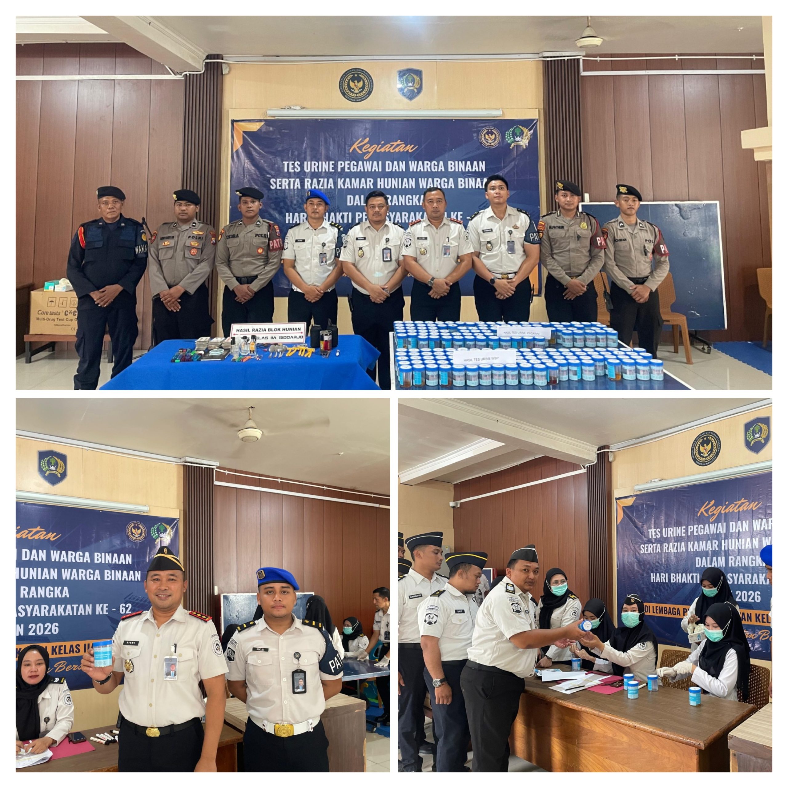 Sidoarjo — Lembaga Pemasyarakatan Kelas IIA Sidoarjo menggelar kegiatan tes urin bagi seluruh pegawai dan warga binaan yang dilaksanakan di aula kunjungan Lapas Sidoarjo, Senin (6/4/2026).