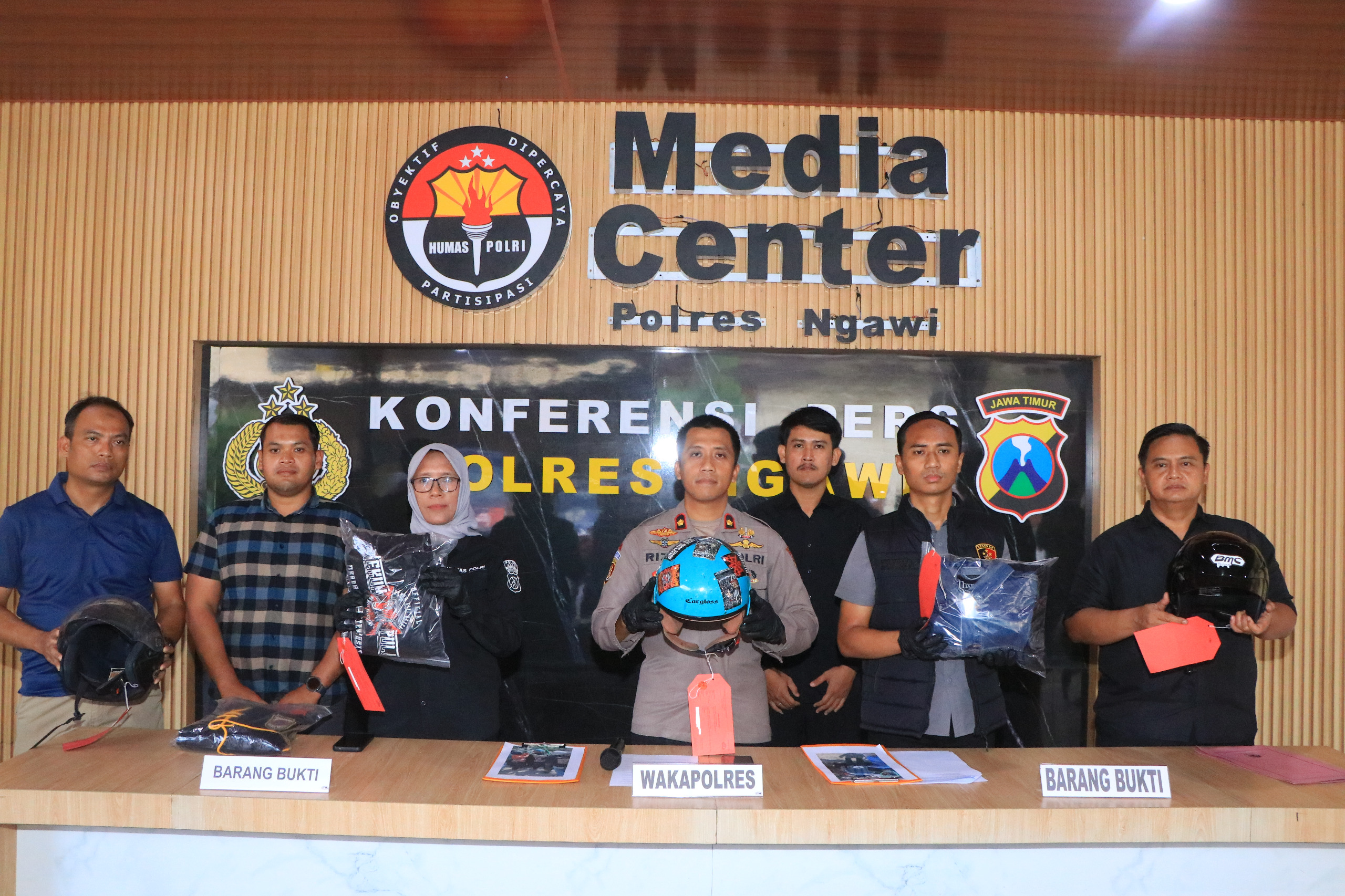 Selain mengamankan pelaku, petugas juga menyita sejumlah barang bukti, di antaranya sepeda motor, pakaian yang digunakan pelaku saat kejadian, serta beberapa helm.